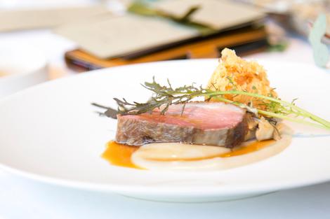 倭鴨のアサード 舞茸と吉野柿のベニエ 蕎麦のピュレとわさびグラニテ トリュフ風味
