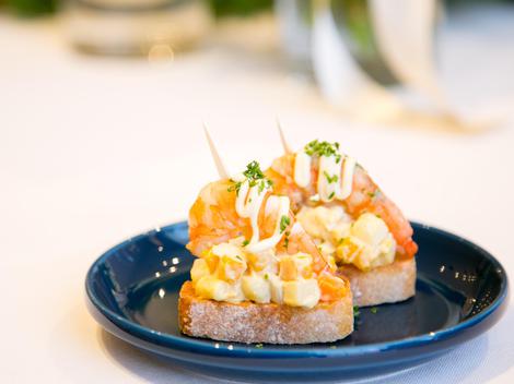 本来はポテトと人参で作るサラダですが今回はかぼちゃを足してアレンジ。新郎様の実家の思い出の味、マカロニサラダのイメージと大好きなエビを合わせて、かぼちゃのエンサラディージャとエビのピンチョスに仕上げています。
