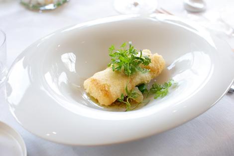 魚料理はハモをフリットにしたベニエです。ふっくらと香りよく揚がったベニエには、シェリービネガーを