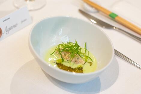 的だったのが、青豆にゼリーを合わせたもの。ということで一品目はサーモンのリエットに合わせてグリーンピースとコンソメのジュレを添えています。