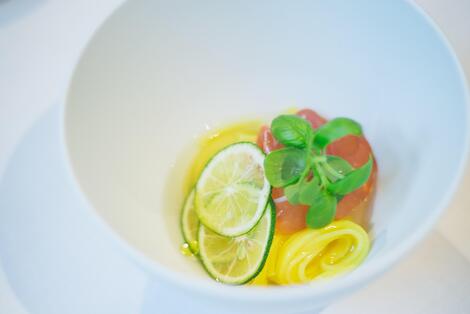 うどんが大好きというお二人が、ぜひ食べて見たいとチョイスした一皿。実は春日大社に行った、初デートのその日も、うどんを食べに行かれたそうです。 日本の古来種で、場を清めると言われる柑橘、大和橘。素麺の老舗がその大和橘を練りこんで仕込んだ通称『大和橘うどん』。麺を使ったお料理です。生ハムの出汁とスライスしたスダチを合わせて、日本的で、スペインの香りのするお料理です。