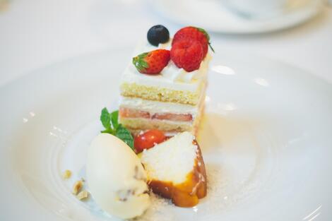 ウェデイングケーキに添えたジェラートは、新婦様がナッツの入ったアイスと『牧場しぼり』のラムレーズンが好きということで、その二つを合わせた『ラムレーズン・ミックスナッツ』。香りと甘み、食感が楽しいジェラートです。また、新郎様にはお母様がよくチーズケーキを作ってくれた思い出があるそうです。今回はスペインバスクのチーズケーキに『追いチーズ』して添えました。奈良の季節の素材、吉野のさくらんぼを添えて仕上げています。幸せのウェディングケーキに、大好きなものと思い出、季節を合わせたデザートです。