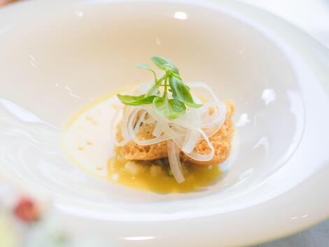 お魚料理は今が旬のハモ。衣をつけてフリットにしたベニエ仕立てのお料理です。ソースはトマトエッセンスと黄色いパプリカ、柑橘で作る少し変わったガスパチョ。